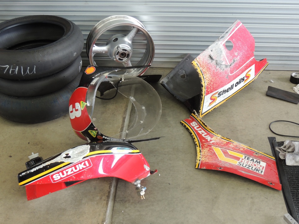 However, one of the Australian draftees for Team USA, Malcolm Campbell, had a shocker. Riding the Mick Neason XR69 Suzuki replica, Wally arrived just behind a slower bike at the fastest part of the track only to find that it had a severe oil leak. The mess that Malcolm’s bike was in when it arrived back in the pits made it look like it would be out for the weekend but Mick and the crew set to work to try and salvage the situation. Malcolm was unhurt but angry. (not happy, Jan)