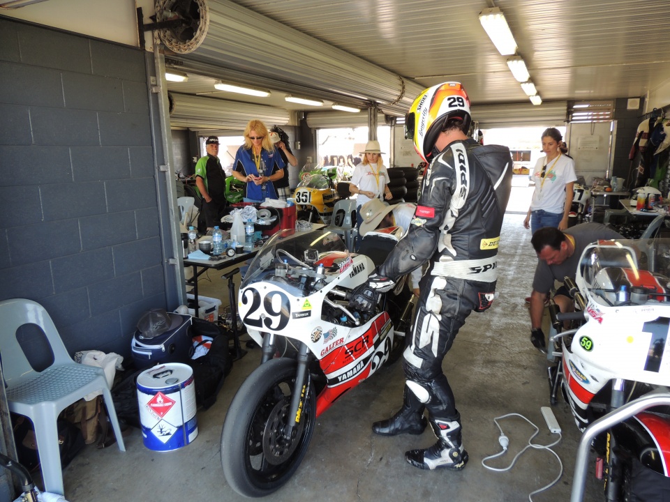 Thursday was a testing day for Island Classic competitors only (Wednesday was a track day and the place was crowded with Valentino Rossi wannabees (so boring). As the day wore on more and more competitors arrived until the pit was pretty close to full by late afternoon. Unlike previous years, my American friends had a pretty good run with the only gremlin being a catastrophic failure in the valve train of Ed Haazer’s MkII Kawasaki that saw the bike parked for the weekend in disgrace. Fortunately, Jimi Mac, who was riding the bike for Ed, brought a spare bike so it wasn’t all that grim (more about Jimi’s outstanding performances later.)