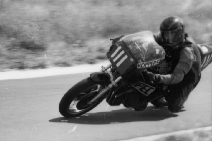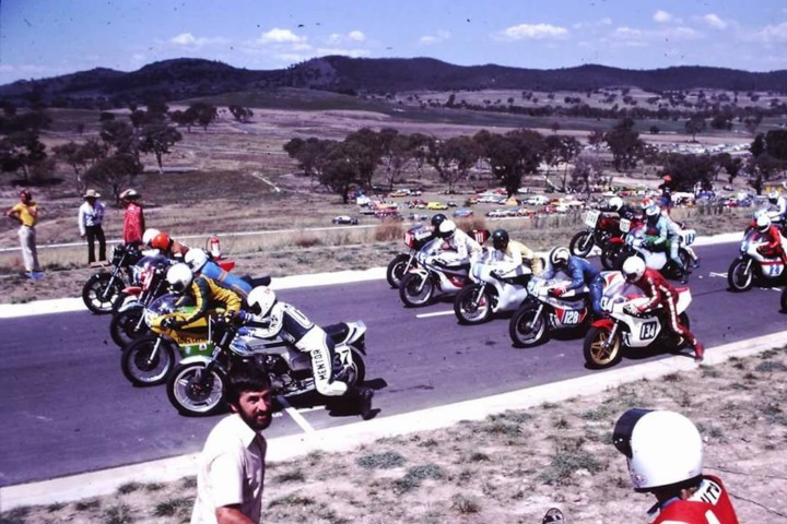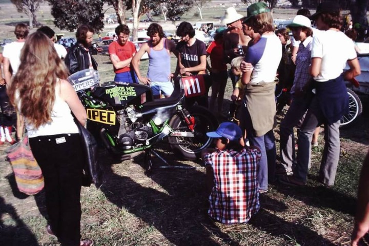 From an archive of photos sent to me by an old CRRC buddy, Bill Bourke, This and the one below show the Shadowfax (or “The Proto” as Kent calls it) at the March 1981 meeting at Macarthur Park. Yes, this photo is almost exactly 40 years old. The Shadowfax is shown in it’s original livery, the Coca Cola 800 appearance and complete with the the signwriting of the February event but with the allocated #111 number that was used at the road closure. I’m certain that Kent is going to identify many of our mates in this pic but that’s him in the middle with the black T shirt standing over the tailpiece of the bike. I suspect that is is a post-Unlimited C Grade shot and the spectators are celebrating Kent’s emphatic win in that race.